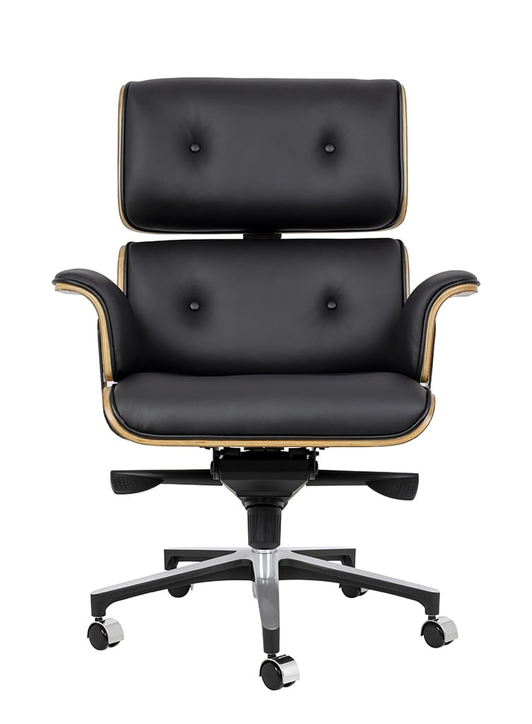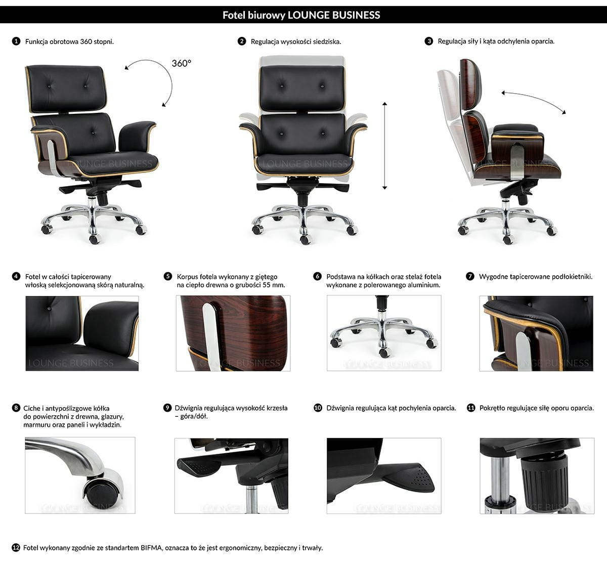 Siedzisko, oparcie, podłokietniki oraz podnóżek, tapicerowane są włoską skórą naturalną w kolorze czarnym.