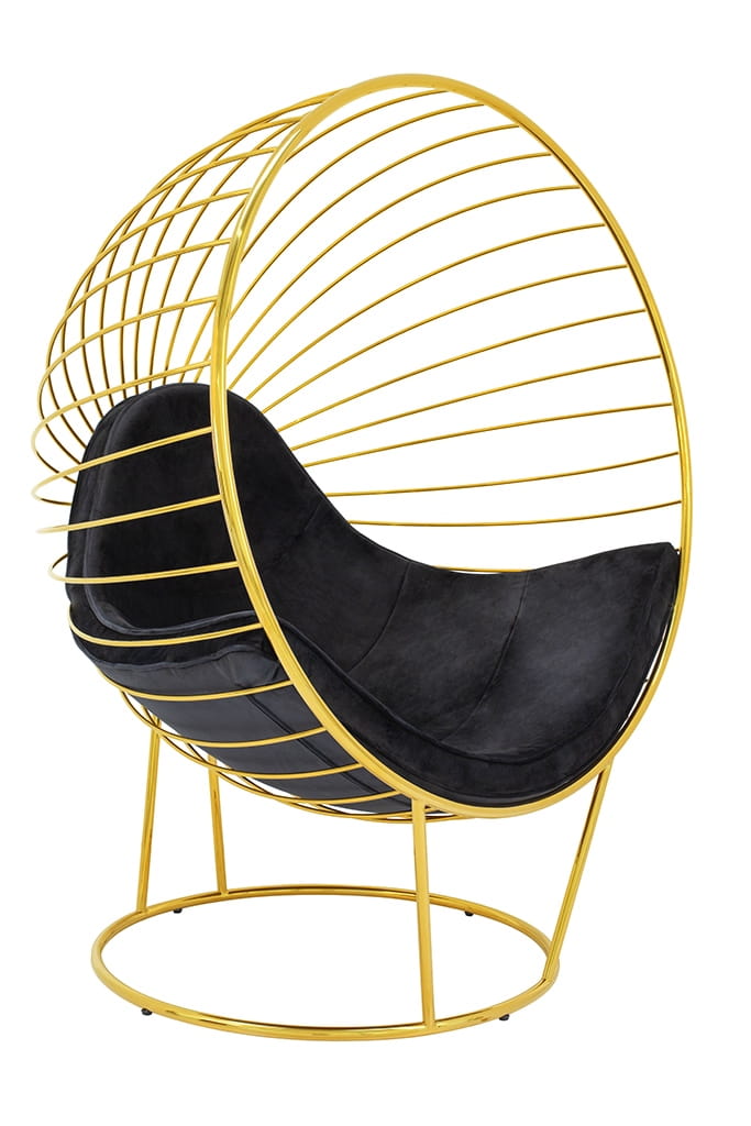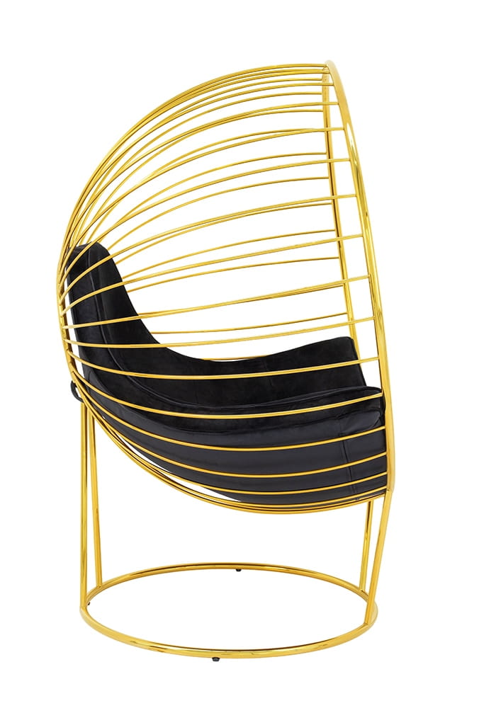 We wnętrzu kulistej formy znajduje się poduszka tapicerowana przyjemną welurową tkaniną w kolorze czarnym.