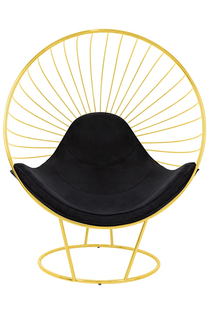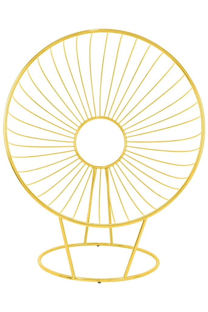 Stelaż fotela wykonany został z metalu lakierowanego na kolor złoty. Korpus kształtem przypomina rozpromienione słońce z ciekawym motywem.