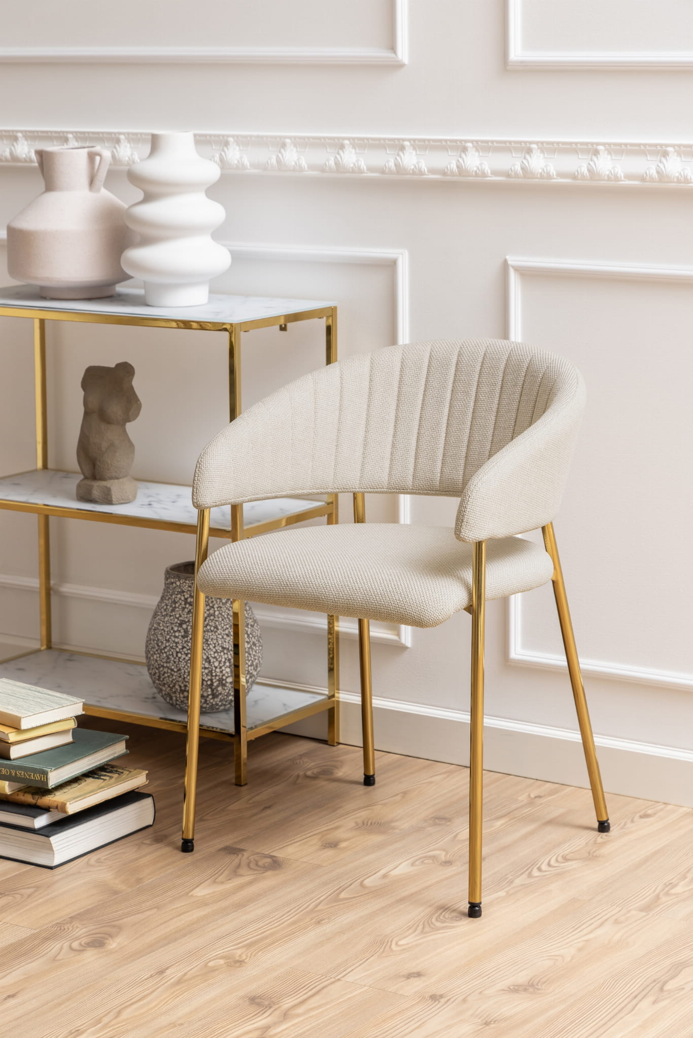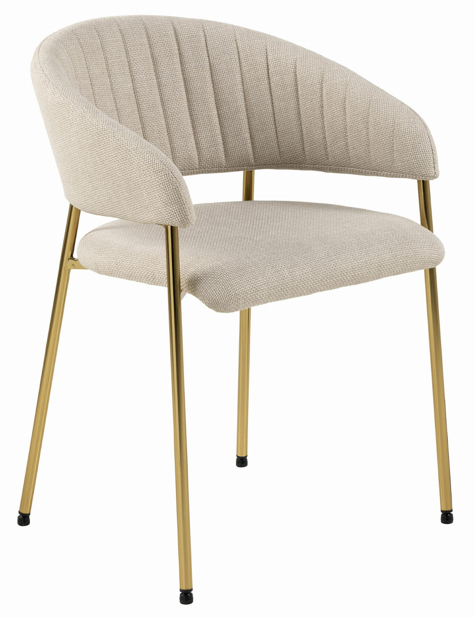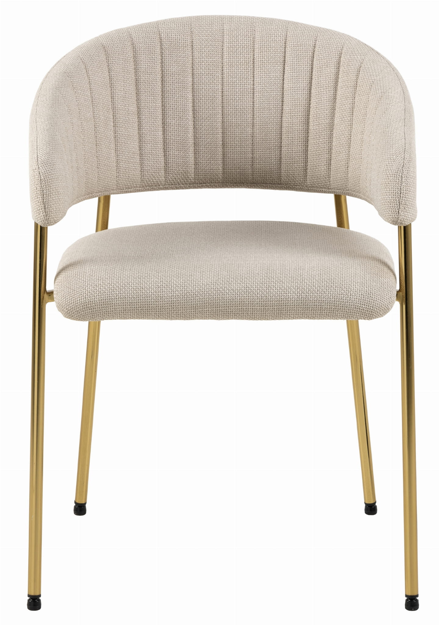 Krzesło Ann to elegancki model w stylu modern glamour. Posiada podstawę złożoną z czterech smukłych nóg wykonanych z metalu w kolorze złotym. U dołu każda z nich zabezpieczona jest nakładką, która zapobiega niszczeniu podłogi. Atutem krzesła są głębokie siedzisko i szerokie oparcie połączone z podłokietnikami. Na tkaninie po wewnętrznej stronie oparcia znajdują się pionowe przeszycia stanowiące prosty, ale wyjątkowo elegancki element dekoracyjny. Tapicerowane elementy krzesła pokryte są pianką tapicerską oraz tkaniną Basel fabric beige 24. Krzesło Ann to opcja idealna do jadalni, bądź elegan
