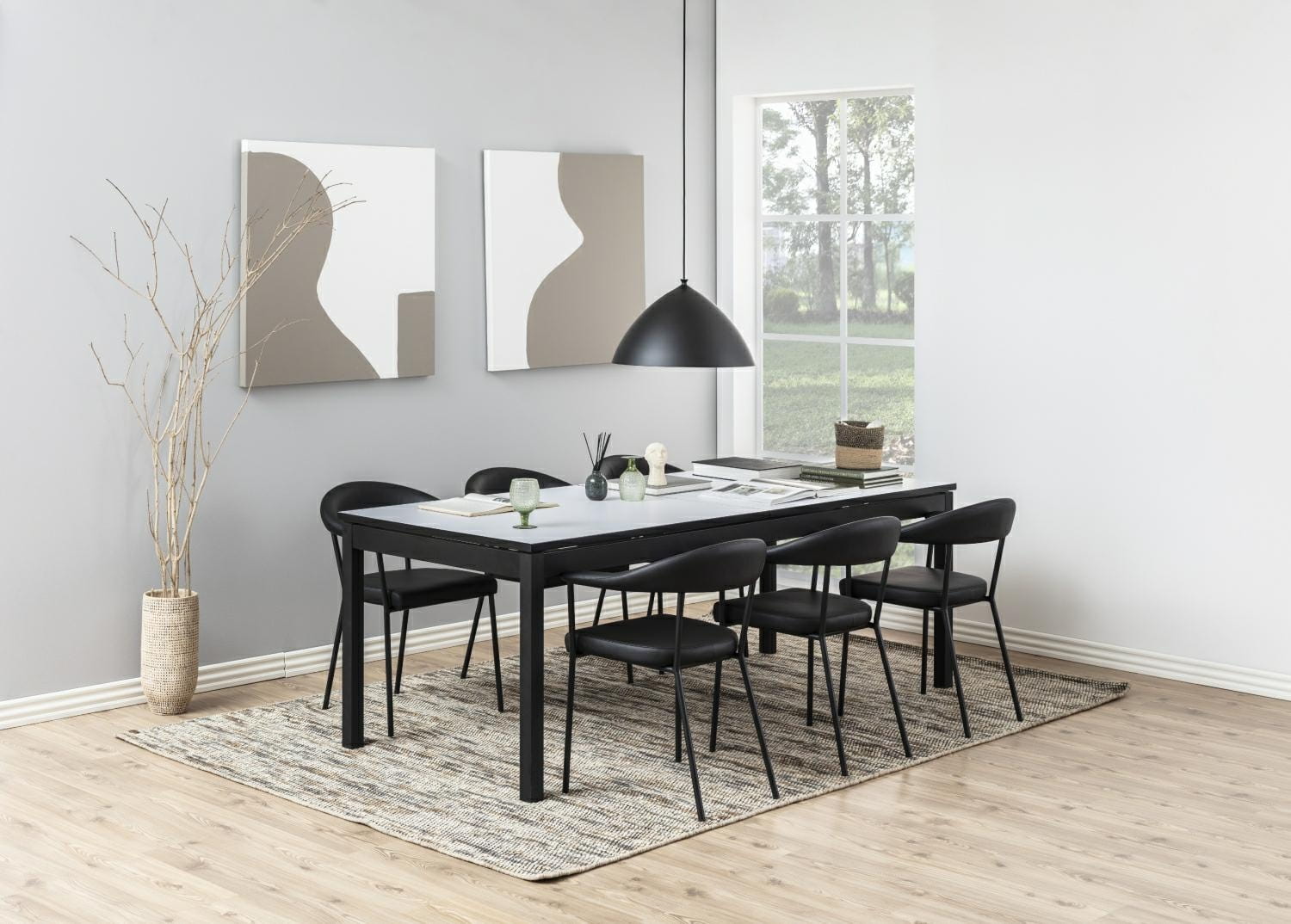 Minimalistyczne Krzesło Ava wykonane zostało z ekologicznej skóry oraz metalu. Siedzisko krzesła i oparcie zostały zrobione z miekkiej gąbki oraz są obszyte czarną klasyczną ekoskórą. Oparcie krzesła tworzy estetyczną całość z połączonymi z nim podłokietnikami. Designerskie nogi krzesła zostały pomalowane proszkowo na czarno, dodatkowo posiadają nakładki, które zabezpieczają przed uszkodzeniami powierzchni. Dzięki temu krzesło pozostanie również stabilne podczas użytkowania. Wysokość siedziska: 47,5 cm Szerokość siedziska: 42,5 cm Głębokość siedziska: 41 cm Wysokość podłokietników: 18,5 cm