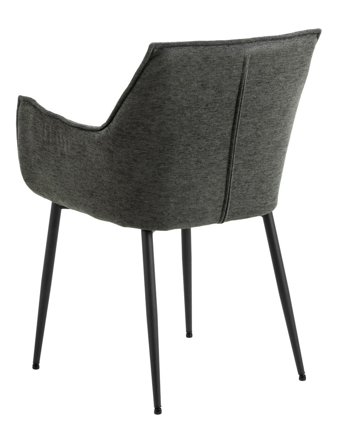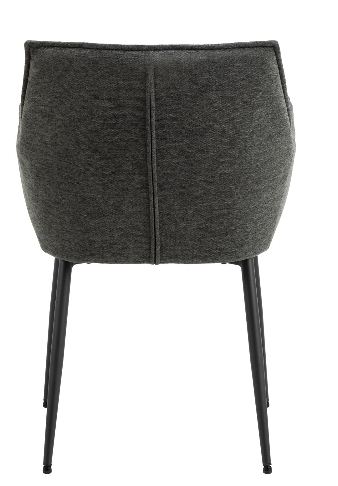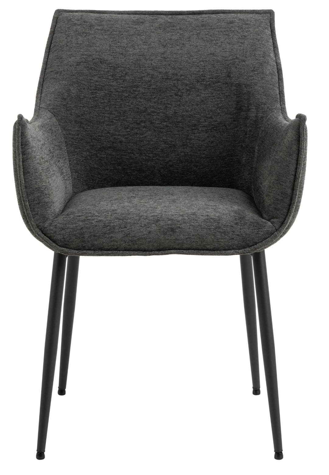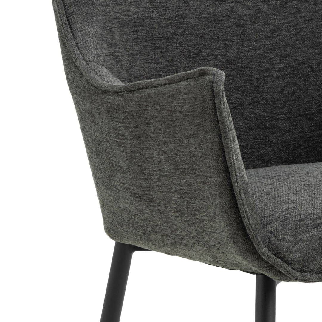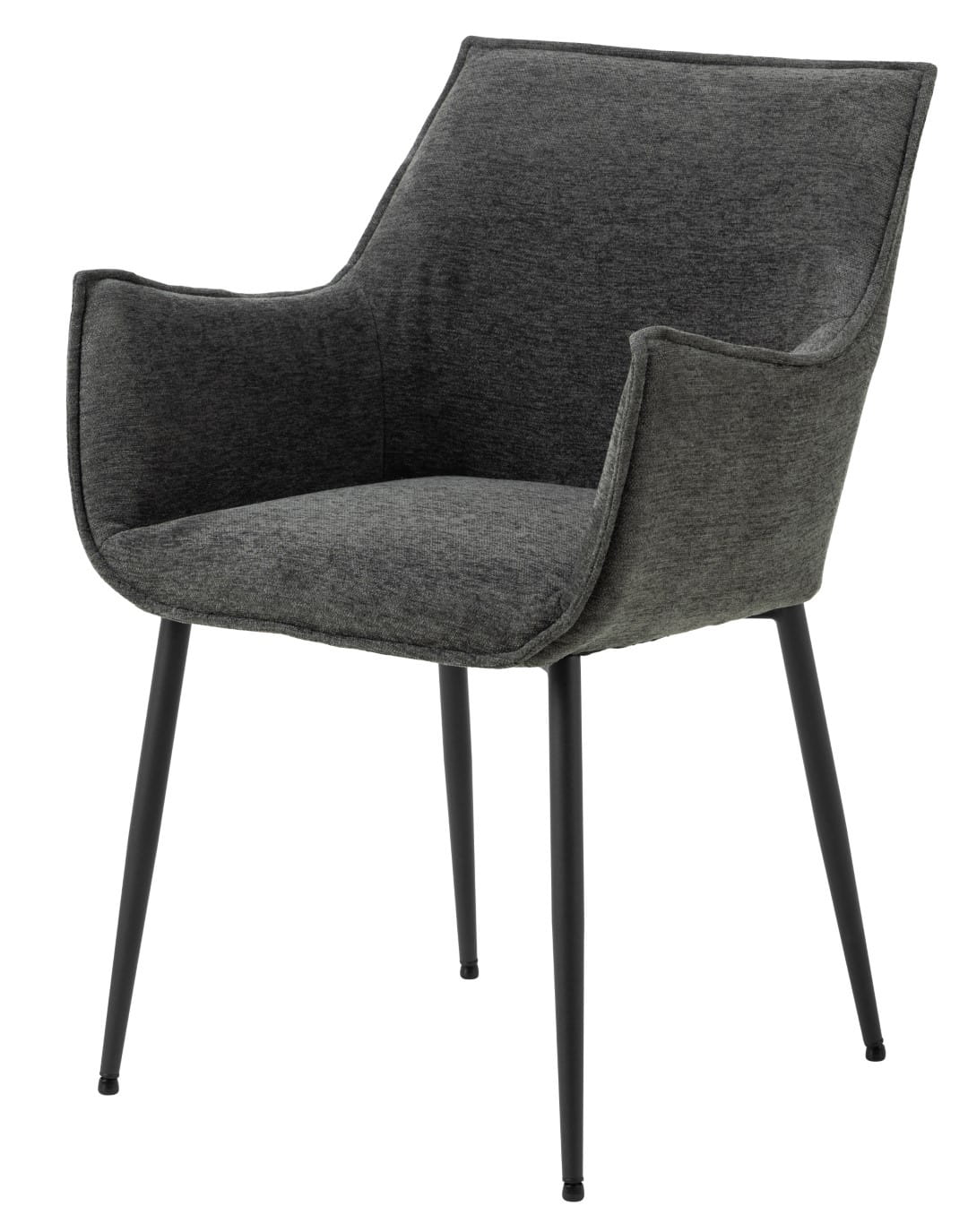 Krzesło do jadalni Bonita z podłokietnikami, tkanina Apia ciemnoszara 458, podstawa czarna matowa, matowa stal malowana proszkowo, z francuskimi przeszyciami i zamkiem błyskawicznym. Gdyby opisać to krzesło do jadalni w kilku słowach, prawdopodobnie byłoby to minimalizm i wygoda. Przeznaczone na duże i małe okazje, charakterystyczne cechy krzesła obejmują jego spiczaste końce, strukturalną ciemnoszarą tapicerkę i eleganckie francuskie szwy. Takie krzesło uzupełnia różnorodne wnętrza domowe. Nowoczesne krzesło do jadalni z podłokietnikami sprawdzi się w salnie jak i w jadalni. Tapicerowane ciemnoszarą tkaniną z przędzą szenilową jest trwała i wygodna. Ozdobne francuskie szwy ze spiczastymi końcami dodają meblowi uroku. Wymaga montażu. Max. obciążnie 110 kg. Waga krzesła: 6,1 kg Wysokość oparcia: 28 cm Wysokośc podłokietników od siedziska: 21cm Szerokość siedziska: 41cm Głębokośc siedziska: 43cm Wymiary kartonu: 58x69x51cm. Max 2 szt w kartonie