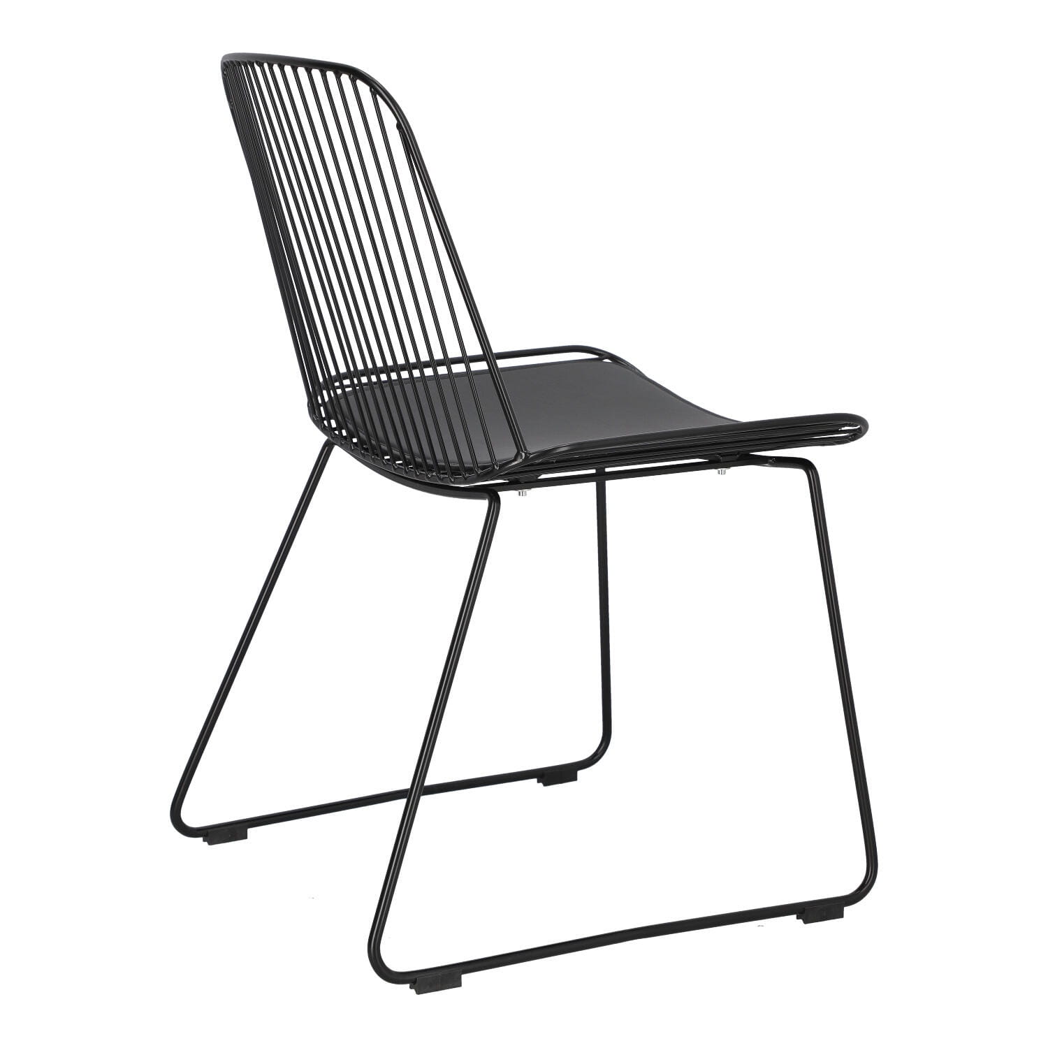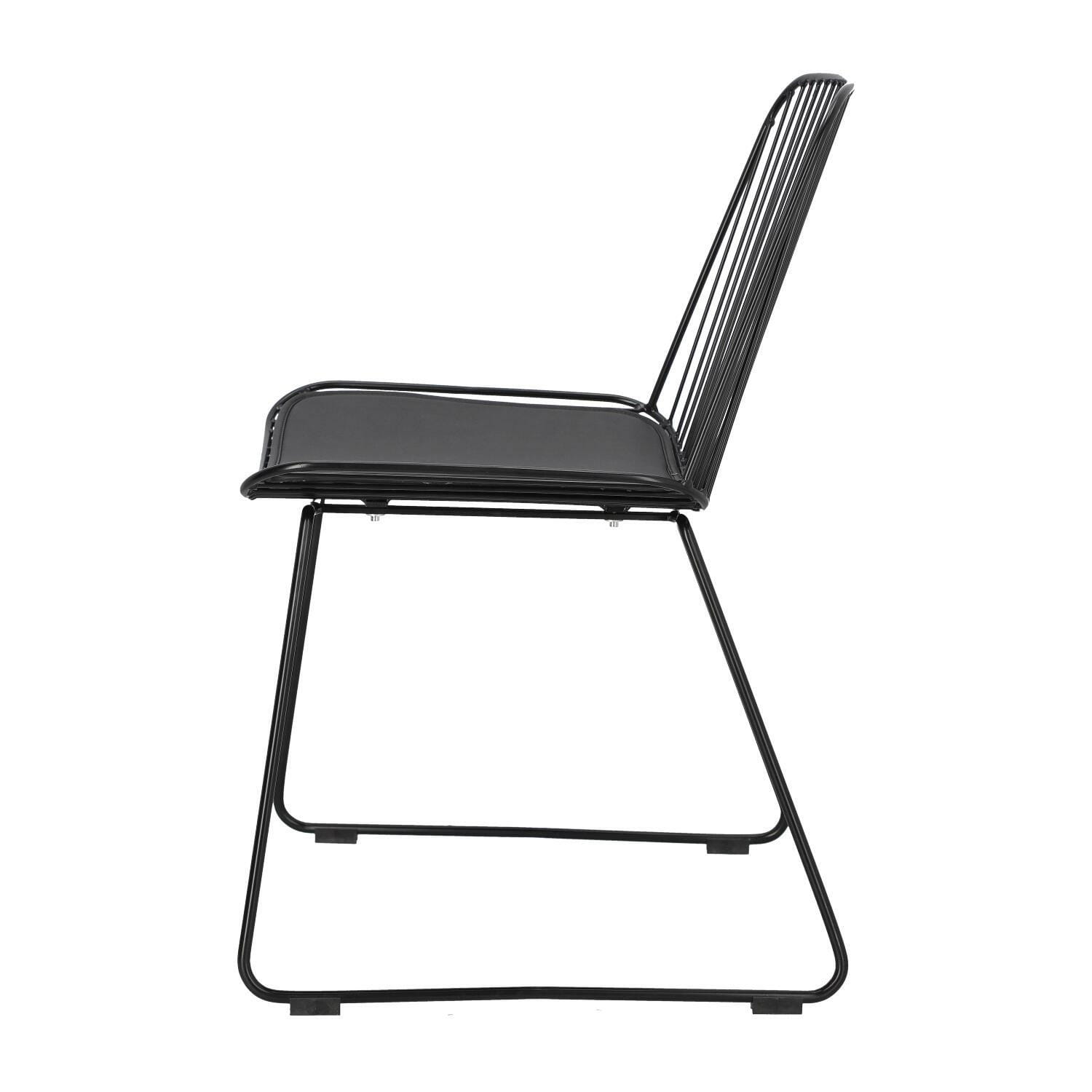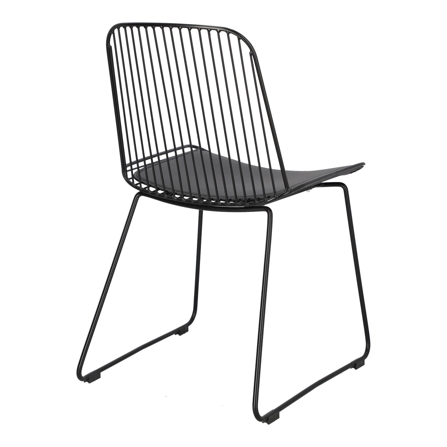 Czarne loftowe krzesło Dill z poduszką z eko skóry to odważny projekt do nowoczesnego wnętrza. Zachwycające w swojej prostocie krzesło będzie nie tylko wygodnym siedziskiem, ale również ozdobą salonu lub jadalni. Krzesło o siedzisku oraz oparciu wykonanych z wielu cienkich przęseł jest nietypowym meblem. Podstawa krzesła to płozy zabezpieczone nakładką z tworzywa, która zapobiega rysowaniu się powietrzni pod krzesłem. Krzesło z metalu pomalowanego proszkowo na czarno utrzymane zostały w półmatowym wykończeniu. Poduszka na siedzisku jest zdejmowana. Wymiary kartonu: 67x91x58 cm Waga: 28kg