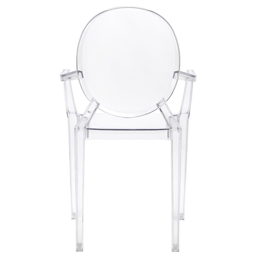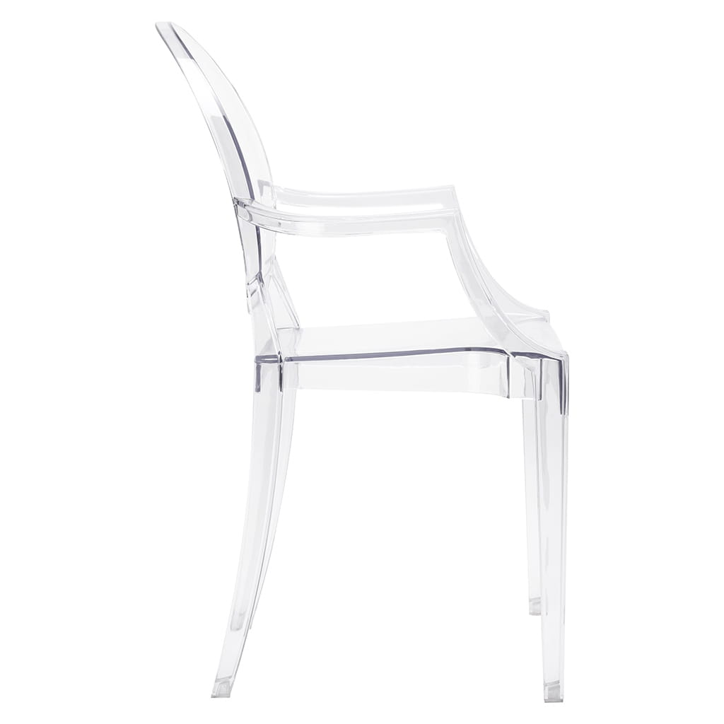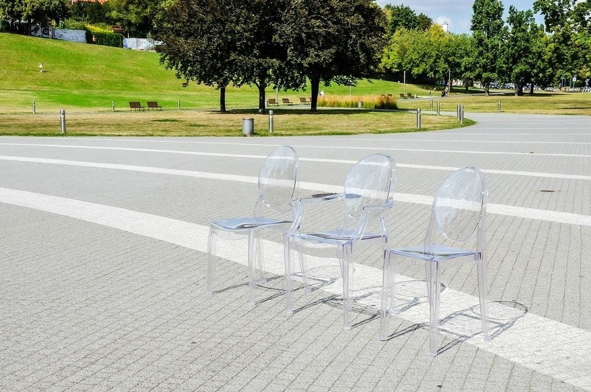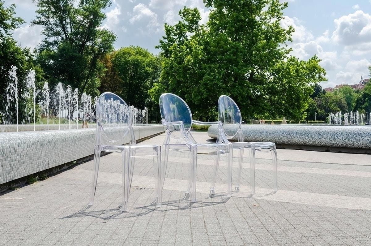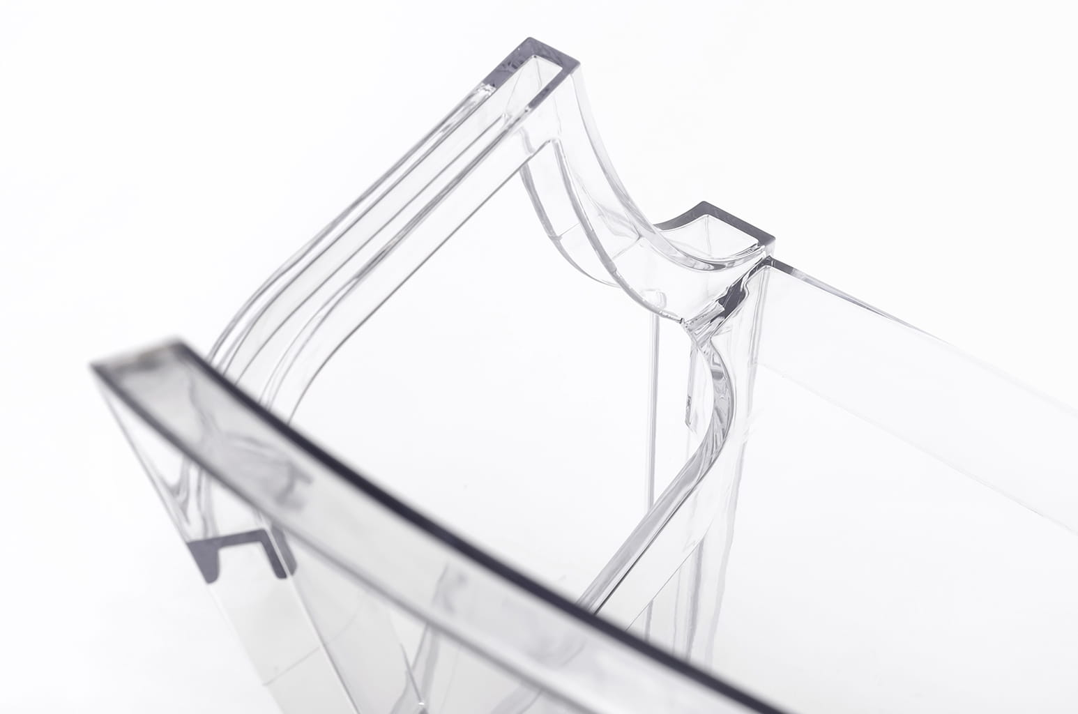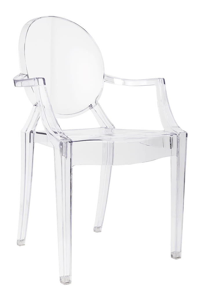 Model ten nawiązuje stylem do mebli w stylu Ludwika XV. Dzięki zastosowaniu przezroczystego materiału, krzesło optycznie