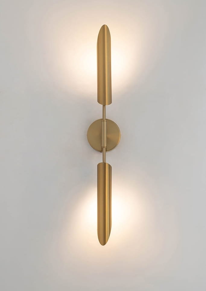 Wykonana w całości ze stali w kolorze złotym. Podłużne klosze z dwóch stron oprawy skrywają źródło światła.