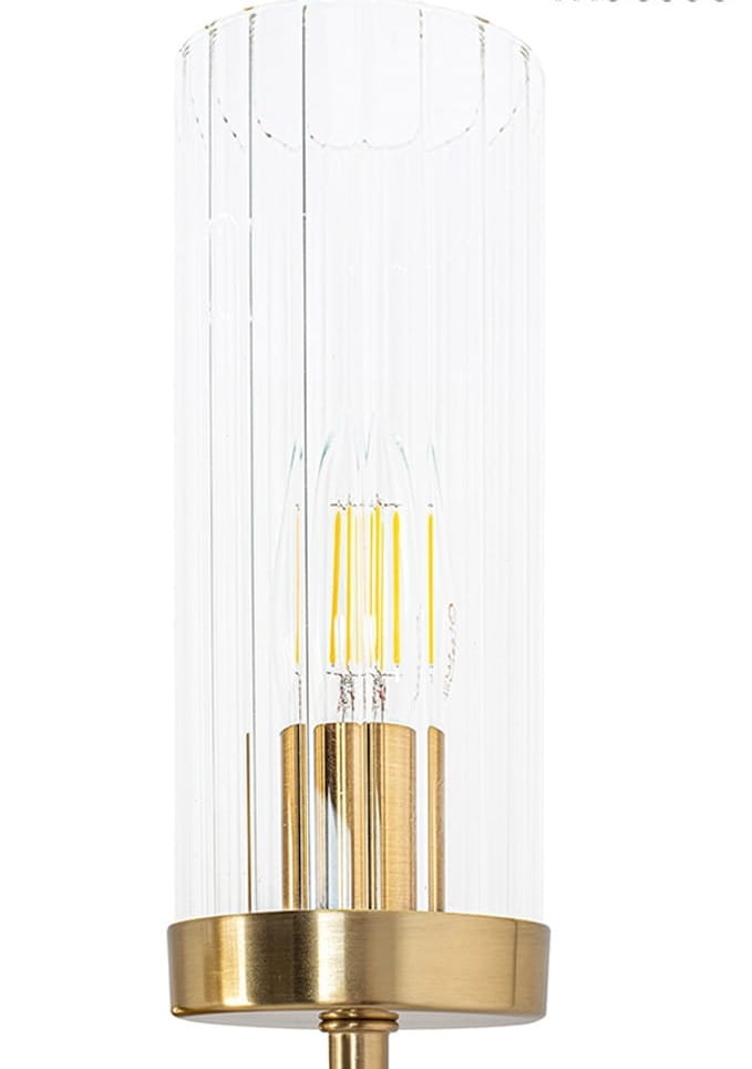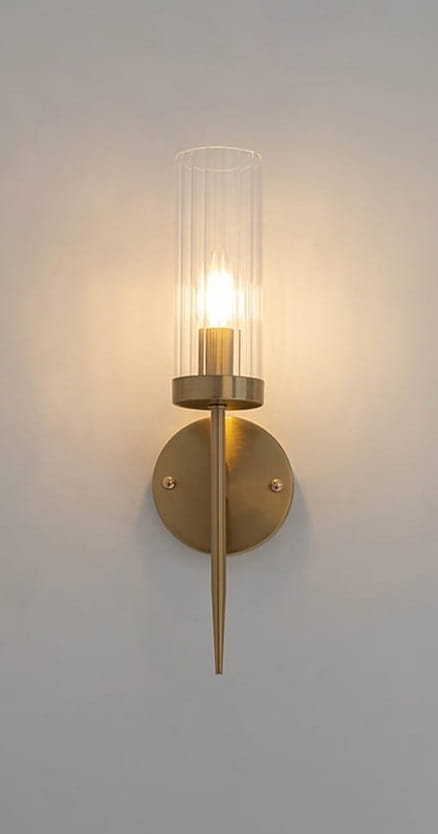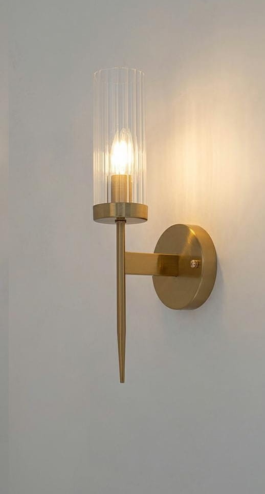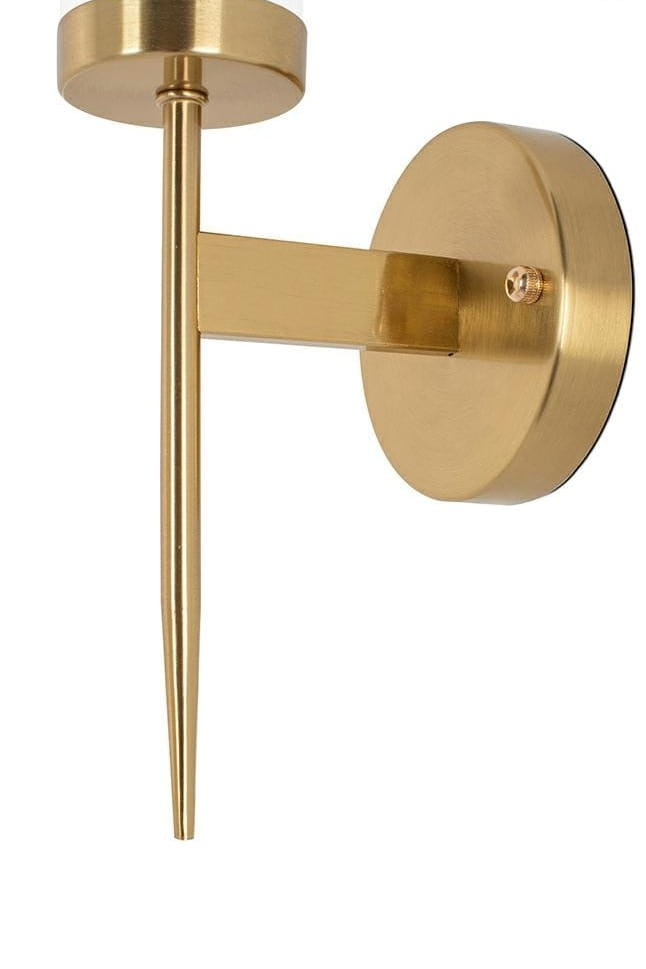 Elegancki kinkiet przypominający nowoczesną pochodnię w stylu glamour. Oprawa została wykonana ze stali w kolorze złotym, a klosz z efektownego kryształu,