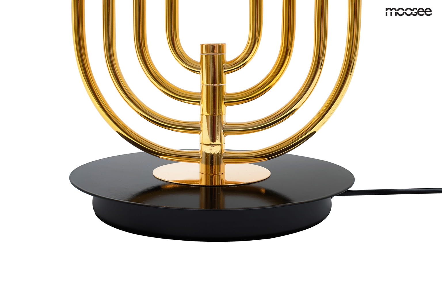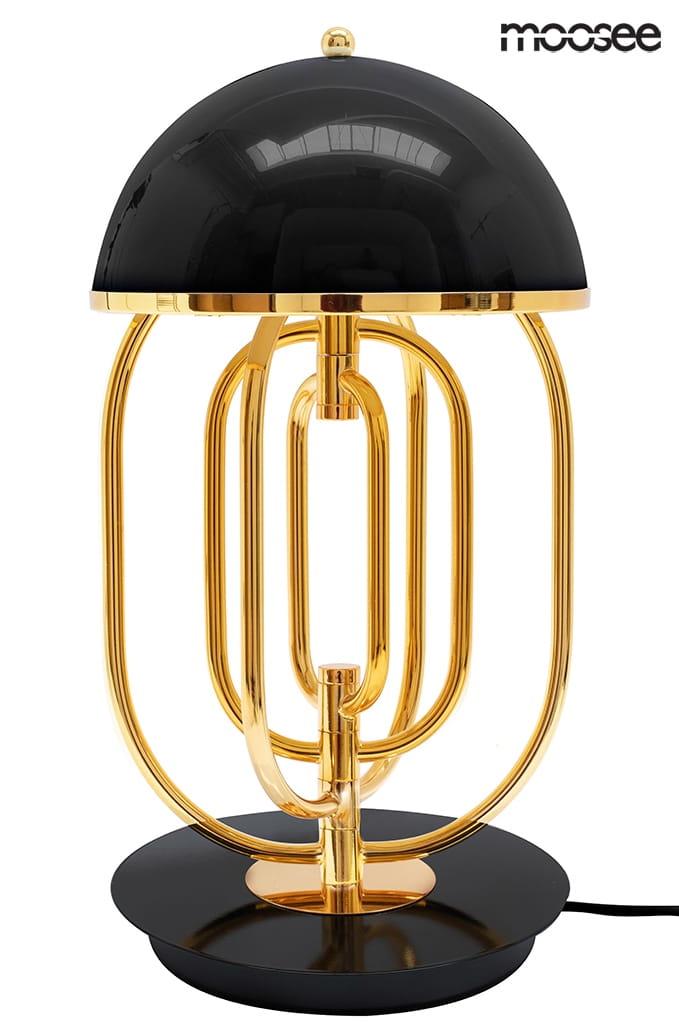 MOOSE lampa stołowa BOTTEGA.Nowoczesna lampa utrzymana w stylu glamour. Została wykonana ze stali w kolorze złotym, a źródło światła skrywane jest pod czarnym kloszem. Bottega doskonale sprawdzi się jako lampka nocna i dekoracja wnętrza.Światło: 2 x G9 max. 5 W (brak w zestawie)Oprawa: wys. 45 cm / szer. 25 cm / gł. 25 cmKlosz: wys. 15 cm / śr. 25 cmPodstawa: śr. 25 cm / wys. 3 cmElement ozdobny: wys. 34,5 cm / szer.24 cm Przewód: 150 cmPrzycisk: 6 cm x 3 cmWaga netto: 3 kgWymiary opakowania: 50 cm / 30 cm / 30 cm.