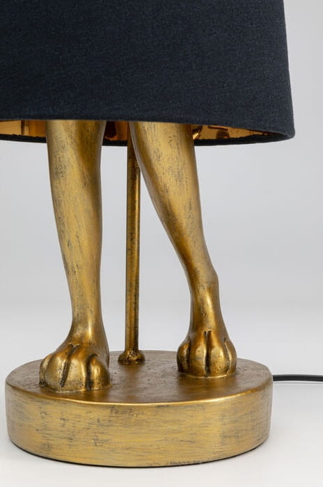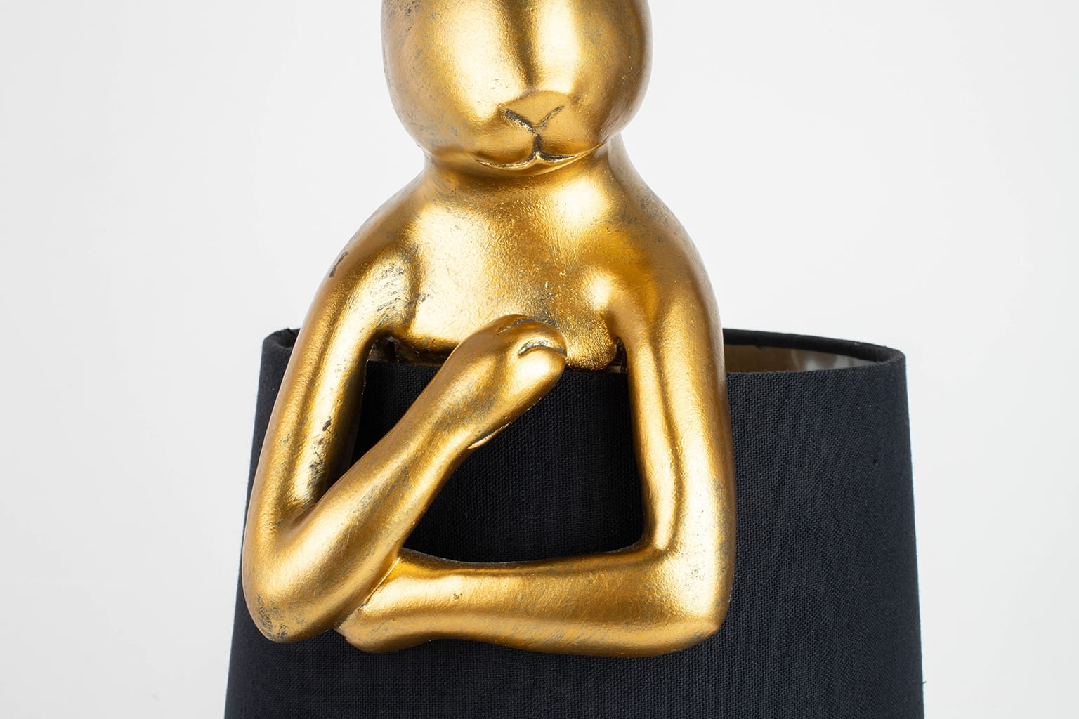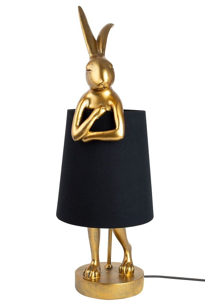 KARE lampa stołowa RABBIT złota / czarna.Wyjątkowa propozycja od marki Kare Design. Przepiękna lampa w kształcie wstydliwego króliczka, który zakrywa się czarnym, lnianym kloszem.Figurka została wykonana z wysoką dbałością o szczegóły z polirezyny lakierowanej proszkowo na kolor złoty. Dekoracyjne, awangardowe oświetlenie przykuwające uwagę idealnie wpasuje się w nowoczesną aranżację w stylu glamour.Światło: E14 max. 5 W (brak w zestawie)Oprawa: wys. 68 cm / szer. 23 cm / gł. 26 cmKlosz: śr. 23 cmPrzewód: 200 cmWaga: 2,2 kg.