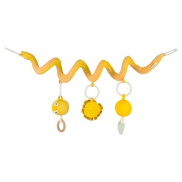 Dzięki trzem zabawnym elementom stymulującym zmysły i pobudzającymi wyobraźnię, zabawka wywoła uśmiech na twarzy każdego malucha. Spirala ładnie zwija się wokół każdego nosidełka, pałąka fotelika, łóżeczka lub kojca. Spirala posiada różne cechy: grzechotka z drewnianym pierścieniem, szeleszczący Lew i lusterko, którymi maluch może się bawić, gdziekolwiek jest. Wykonana jest z miękkich i przyjemnych w dotyku materiałów.