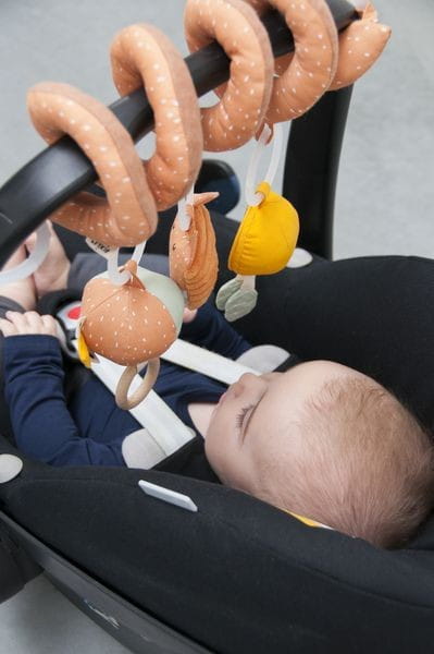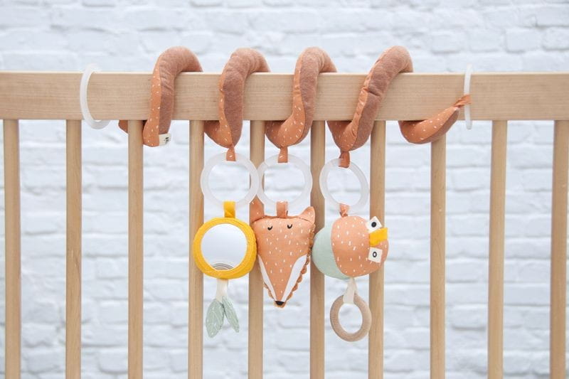Dzięki trzem zabawnym elementom stymulującym zmysły i pobudzającymi wyobraźnię, zabawka wywoła uśmiech na twarzy każdego malucha. Spirala ładnie zwija się wokół każdego nosidełka, pałąka fotelika, łóżeczka lub kojca. Spirala posiada różne cechy: grzechotka z drewnianym pierścieniem, szeleszczący Lis i lusterko, którymi maluch może się bawić, gdziekolwiek jest. Wykonana jest z miękkich i przyjemnych w dotyku materiałów.