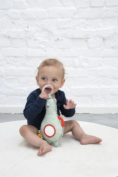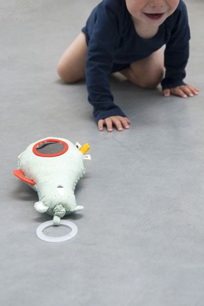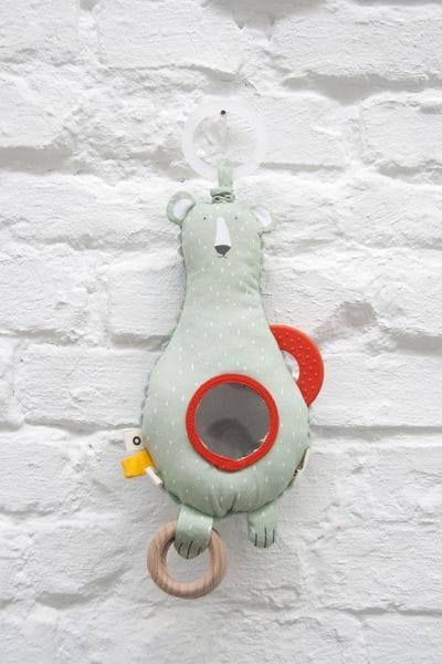 Zawieszka z lusterkiem na brzuszku to miękka i miła w dotyku zabawka, która pobudza wyobraźnie każdego maluszka. Pozwala odkrywać kolory, dźwięki, tekstury i przyglądać się sobie w mini lusterku. Kontrastowe kolory stymulują zmysł wzrok, różnego rodzaju tekstury materiałów i wystające elementy zmysł dotyku, a intrygująca dźwiękiem grzechotka zmysł słuchu. Można ją przymocować do łóżeczka, nosidełka, wózka lub pałąka fotelika samochodowego.