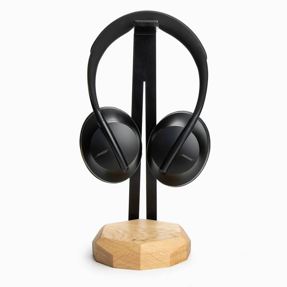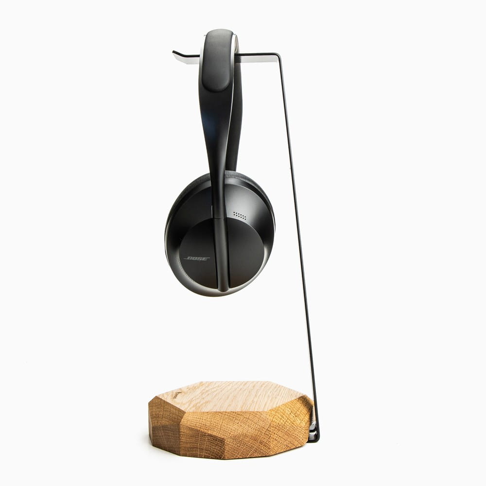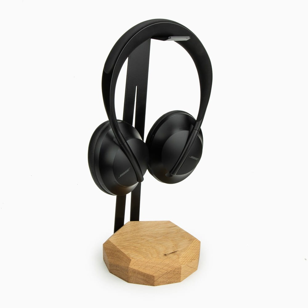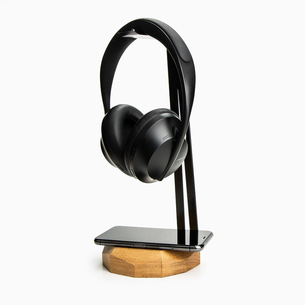 Drewniany stojaki na słuchawki wyposażone w moduł ładowania indukcyjnego. Wykonany jest ze specjalnie wyselekcjonowanych fragmentów litego drewna dębowego. Idealne połączenie drewna z surowym pięknem giętej stali barwionej na czarno. Drewniany uchwyt na słuchawki to doskonałe uzupełnienie przestrzeni biurkowej.