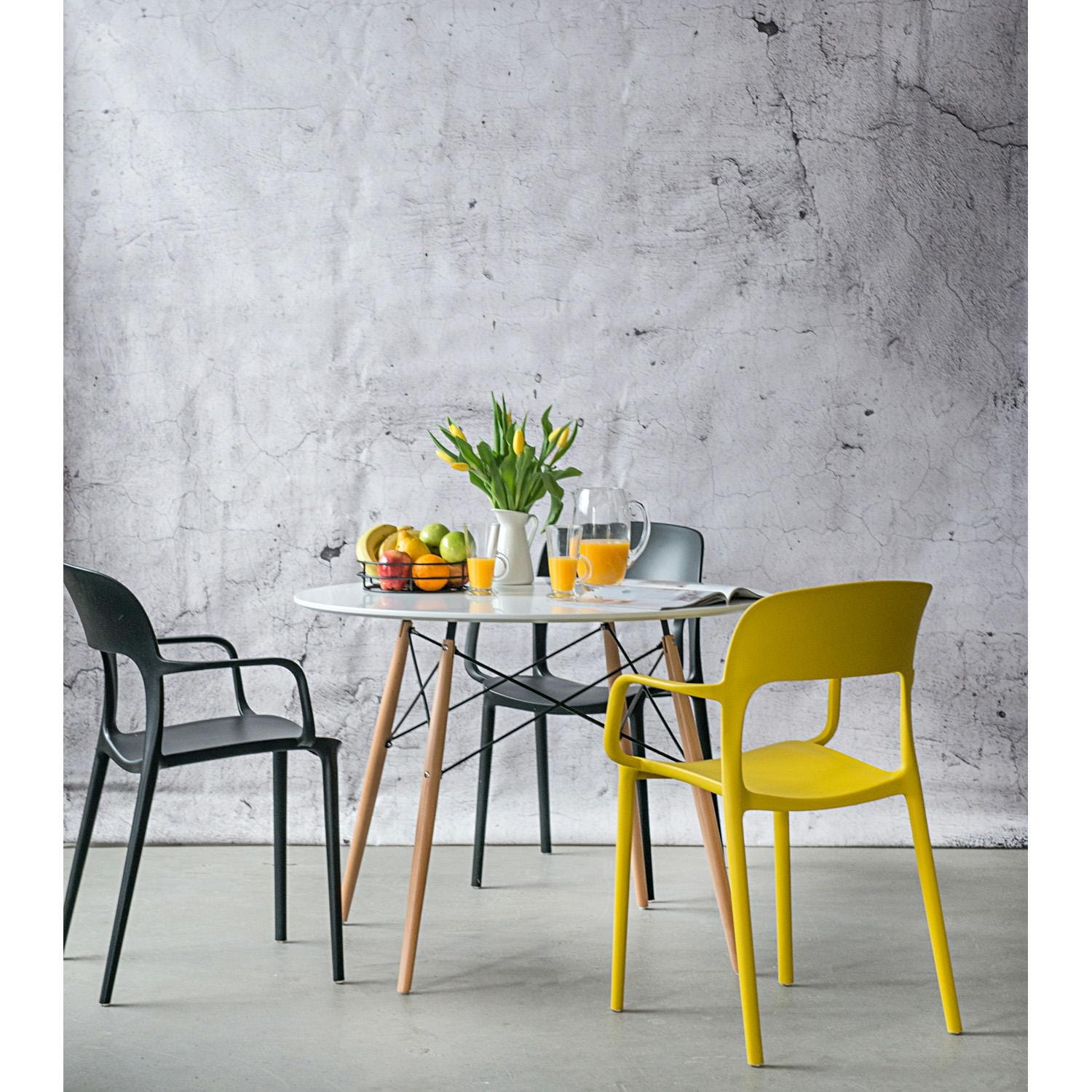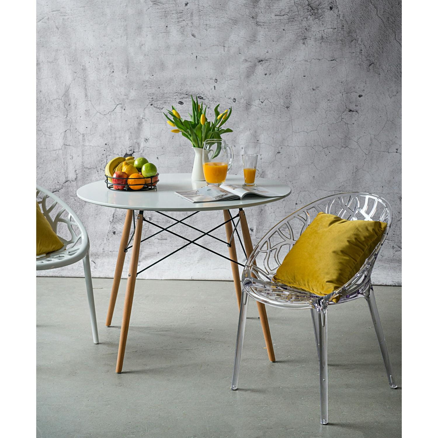 Niezwykły stolik o klasycznej formie. Blat stołu wykonany jest z lakierowanej płyty MDF. Podstawa wykonana jest z drewna bukowego oraz metałowych łączeń lakierowanych na czarno kontrastujących z białym blatem stolika.
