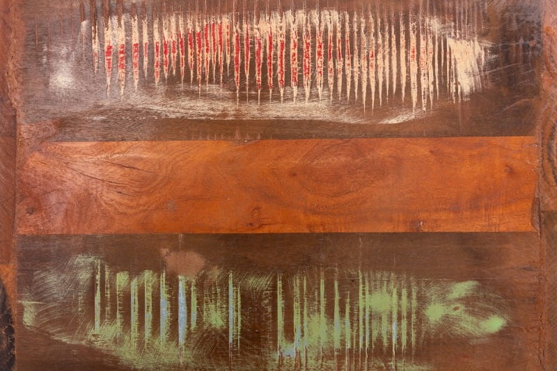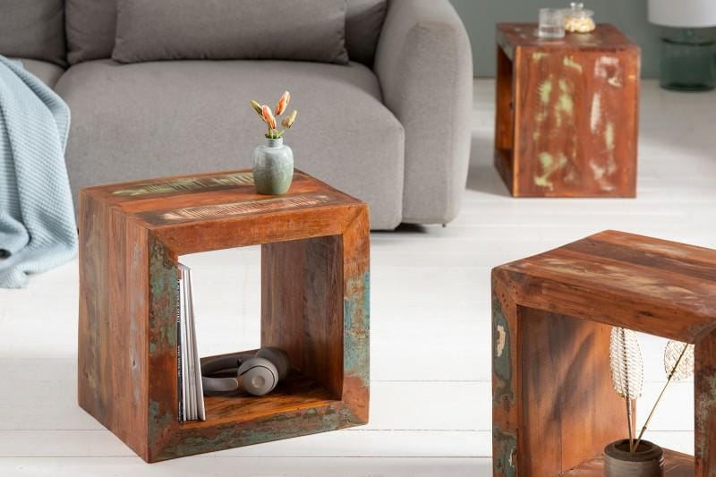 Stolik to stolik, który został zrobiony z drewna poddanego recyklingowi, i pomalowany na naturalny brąz.