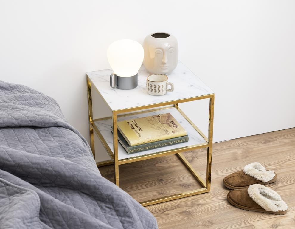 Szafka nocna Alisma w ponadczasowym stylu glamour. Posiada szkielet z chromowanego metalu w kolorze złotym oraz kwadratowy blat i półkę ze szkła pokryte wzorem imitującym biały marmur. Od spodu szafka została zabezpieczona nakładkami z tworzywa. Szafka nicna Alisma to kwintesencja elegancji. Ilość kartonów: 1 Wymiary kartonów: 54,5x48x11,5cm Waga kartonów: 9,3kg