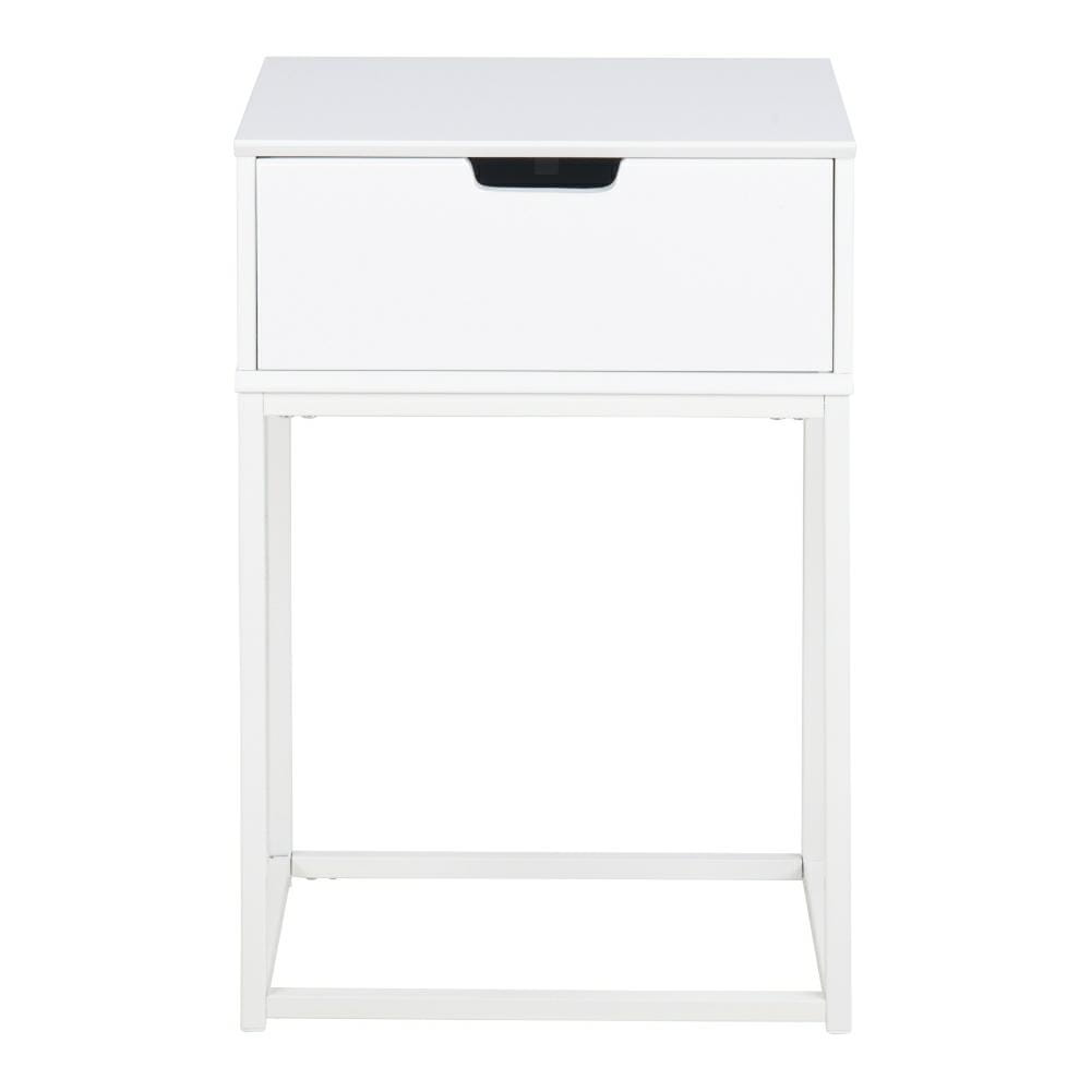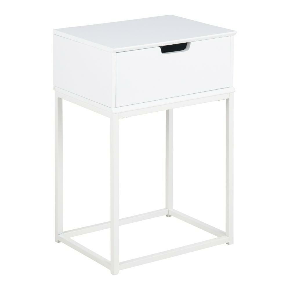 Szafka nocna Mitra utrzymana w stylu skandynawskim wykonana została z płyty MDF w kolorze białym. Podstawę stanowią nogi wykonane z metalu polakierowanego na buiało.. Całość prezentuje się wyjątkowo subtelnie i nowocześnie. Szafka wyposażona jest w jedną bardzo pojemną szufladę. Waga: 6,5 kg. Wymiary kartonu: 52,3cm x 34,2cm x 10,2cm