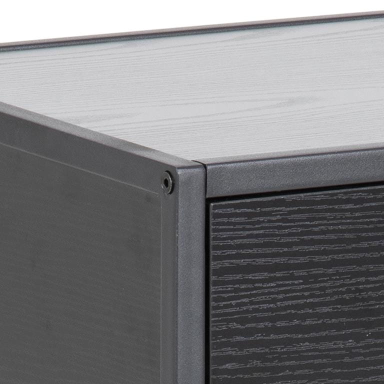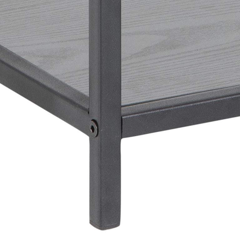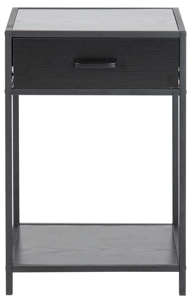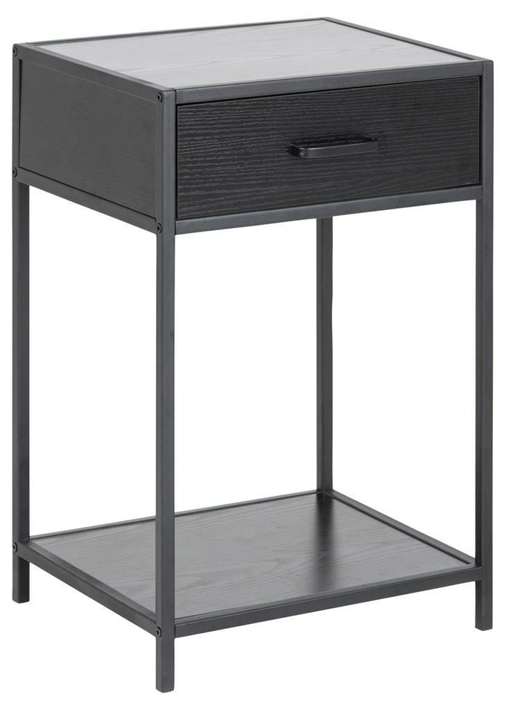 Szafka nocna Seaford to industrialny mebel wykonany z metalu oraz płyty MDF wykończonej laminatem w kolorze czarnym. Podstawa jak i baza posiadają matowe wykończenie. Całość mebla utrzymana jest w ciemnej kolorystyce. Maksymalne obciążenie szafki wynosi 30kg, wymaga ona montażu, waży 8kg. Max. ilość sztuk w paczce: 1 Wymiary kartonu: 69cm x 11cm x 38cm