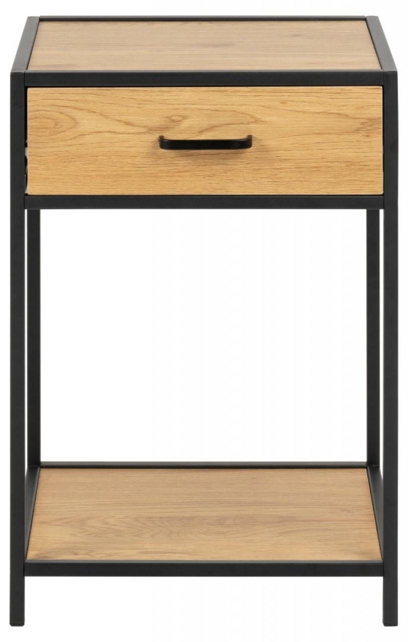 Szafka nocna Seaford to industrialny mebel wykonany z metalu oraz płyty MDF wykończonej laminatem w kolorze dzikiego dębu. Podstawa jak i baza posiadają matowe wykończenie. Całość mebla utrzymana jest w naturalnej kolorystyce połączonej z kontrastową czernią. Maksymalne obciążenie szafki wynosi 30kg, wymaga ona montażu, waży 8kg. Max. ilość sztuk w paczce: 1 Wymiary kartonu: 69cm x 11cm x 38cm