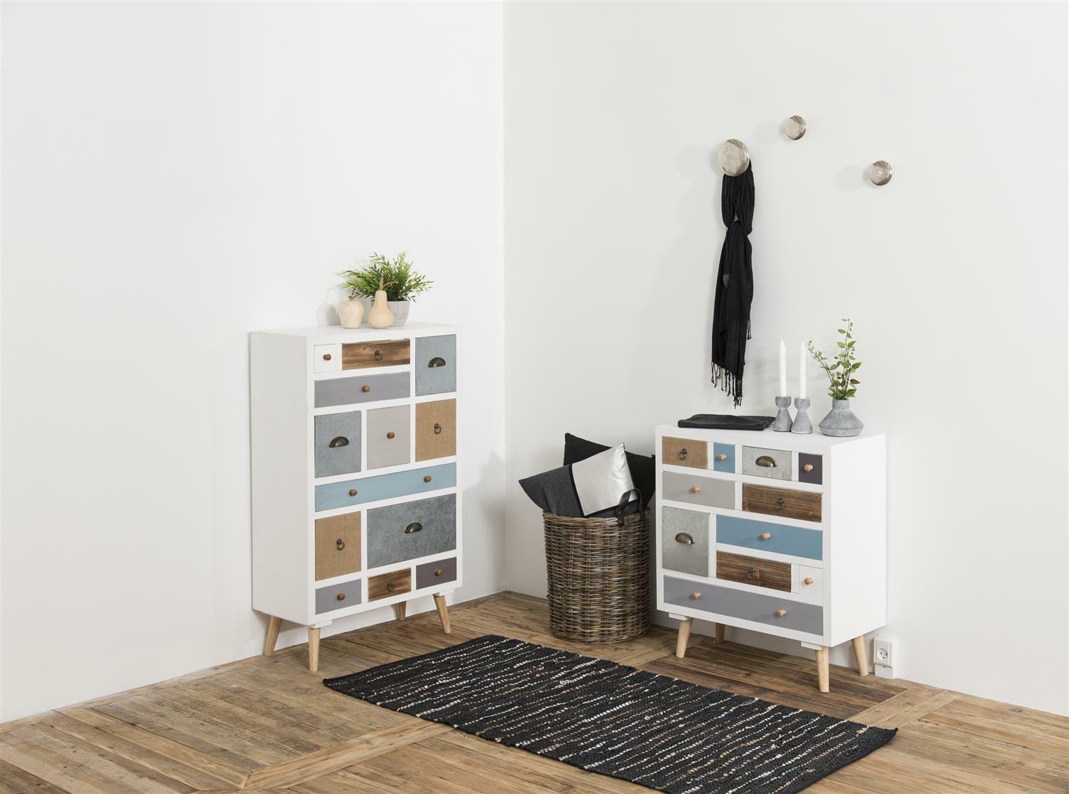 Szafka nocna Thais to mariaż faktur i kolorów. Wykonana z drewna sosnowego i płyty MDF szafka, o różnej wielkości szuflad, pomieści przeróżne drobiazgi.Szafka nocna Thais doskonale sprawdzi się jako szafka do salonu czy klasyczna szafka nocna. Wysokość nóżek: 15 cm