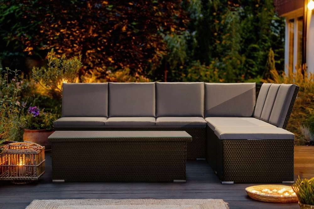 Zestaw mebli ogrodowych narożnik stolik pufa taras ciemny brązowy