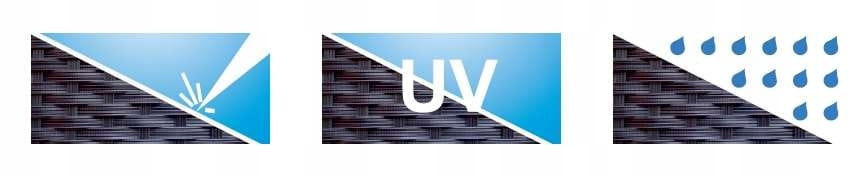 Produkt cechuje wysoka wytrzymałość i odporność na warunki atmosferyczne (wilgoć zabrudzenia ,deszcz, promienie UV ).Jest to solidny i trwały materiał ,który zapewnia wieloletnie użytkowanie i jest łatwy w czyszczeni .
